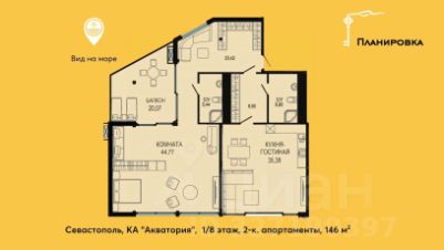 Продажа последнего видового апартамента 146 м² на верхнем 7 этаже комплекса апартаментов Акватория, на первой береговой линии Севастополя, с песчаным пляжем.