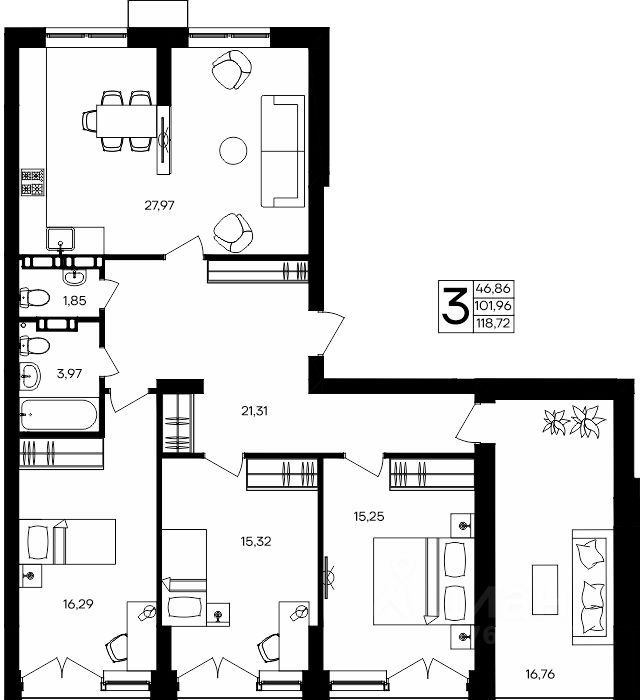 Продаётся 3-комнатная квартира в строящемся доме (Дом 8), срок сдачи: III-кв. 2028, общей площадью 118.72 кв.м., на 9 этаже. "Семисчастье" - город счастья.