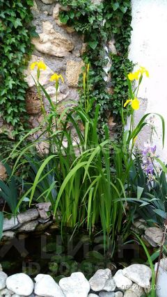 Территория двора в плитке, два пруда с водяными ирисами, лилиями, рыбками, розы, много цветов.