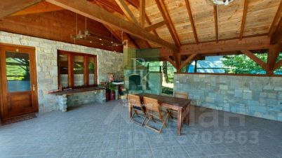 На террасе расположены камин-барбекю с кухонной зоной (газовая плита и раковина) и большой обеденный стол.