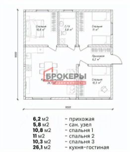 - 3 спальни(10.8 м²,11.0 м², 10.3 м²),