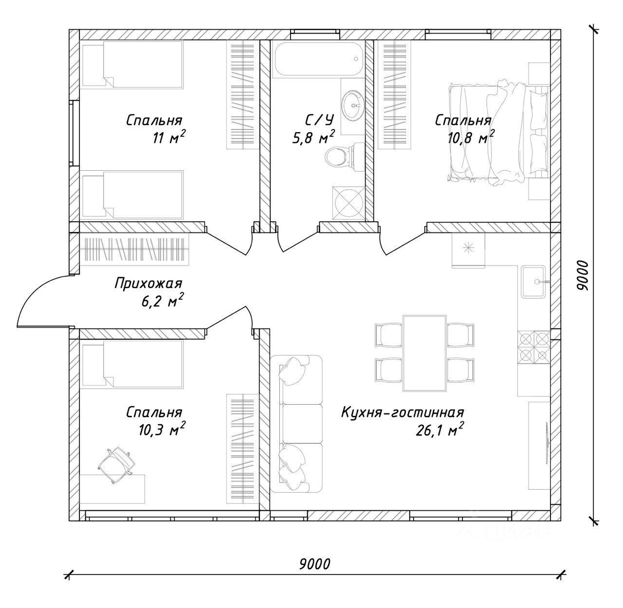 Три спальни высота потолков 3 м, просторная кухня-гостиная с выходом на террасу высота потолка 4,3 м.
