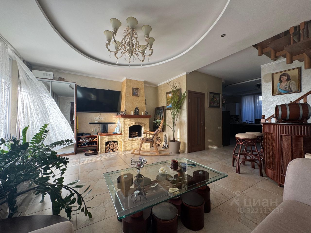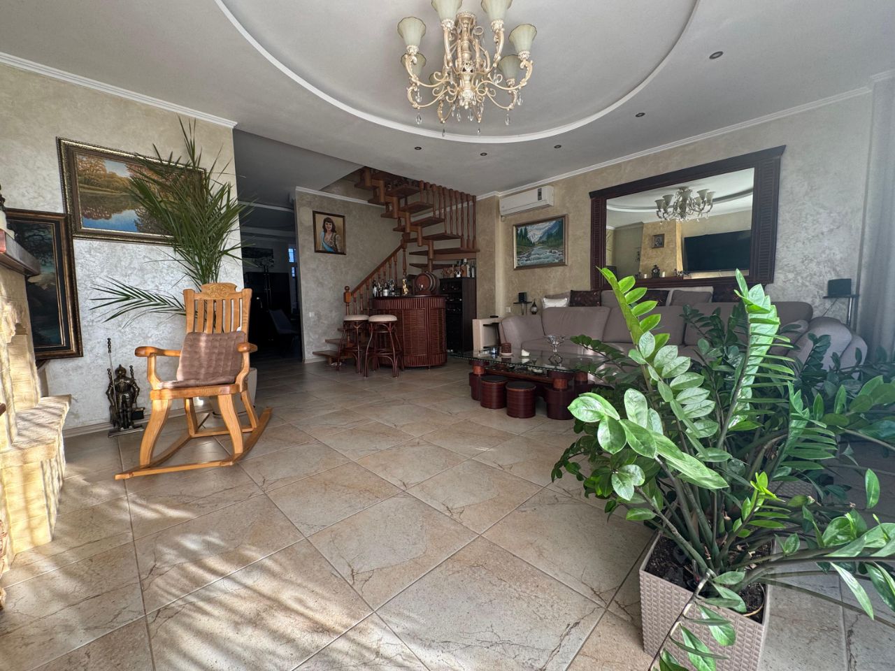 На первом этаже находится гостиный зал с каменным камином (работает на 5+) и зоной отдыха, просторная кухня с выходом на лоджию, совмещенный санузел.