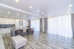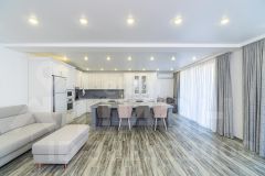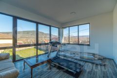 На первом этаже расположены: просторная кухня-гостинная (55 кв.м.) с премиальной мебелью сделанной заказ и отдельным выходом во двор, санузел с душевой и биде (20 кв.м.), гараж (37,5 кв.м.), прачечная и котельная, а также отдельная комната для хранения оружия. Второй этаж включает в себя прихожую, три уютные спальни, ванную комнату и светлую гостиную с выходом на застекленную террасу, откуда открывается потрясающий вид на всю долину!