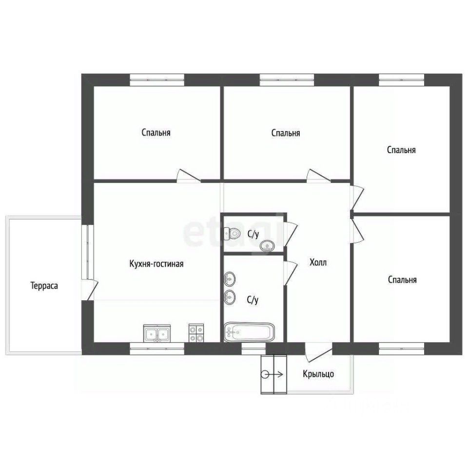 Кухня-гостиная, 4 спальни, ванная комната, С/У, длинный коридор, со вторым входом.