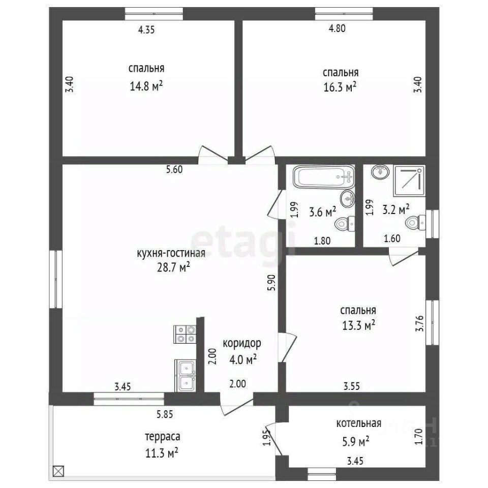 Терасса-11,3 кв.м.,коридор-4,0 кв.м.,кухня-гостиная -28.7 кв.м. и выходом во двор, три раздельные спальные комнаты - 14,8; 16,3; и 13, 3 кв.м, два сан.узла - 3,6 и 3,2 кв.м, котельная- 5,9 кв.м.