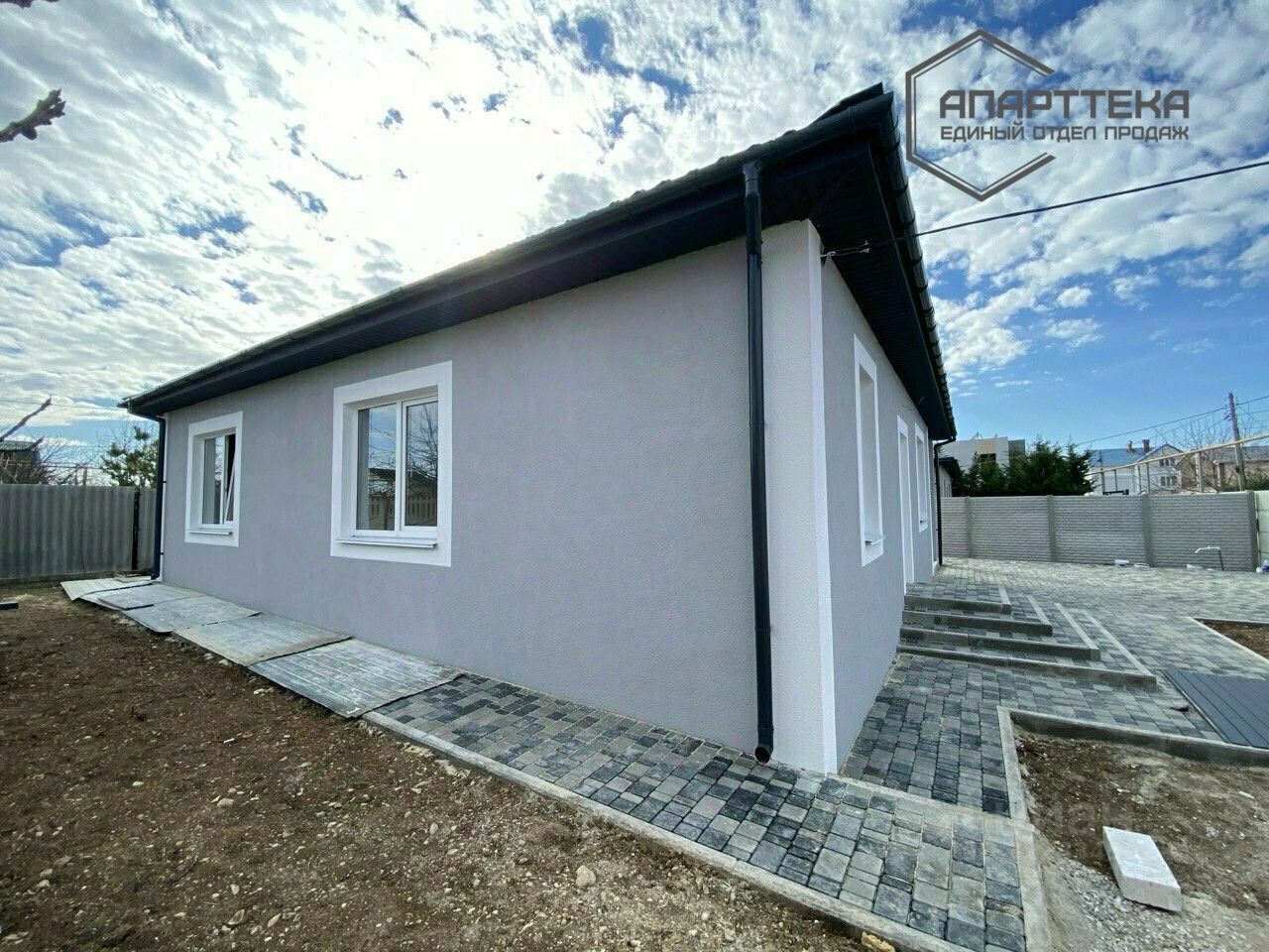 Участок правильной формы, ровный. Место парковки автомобиля, входная группа и терраса вымощены тротуарной плиткой в цвет фасада дома. Установлен забор из "французского камня", входная группа оборудована откатными воротами и калиткой. До получения готового дома мечты под ключ потребуется совсем немного времени и средств.