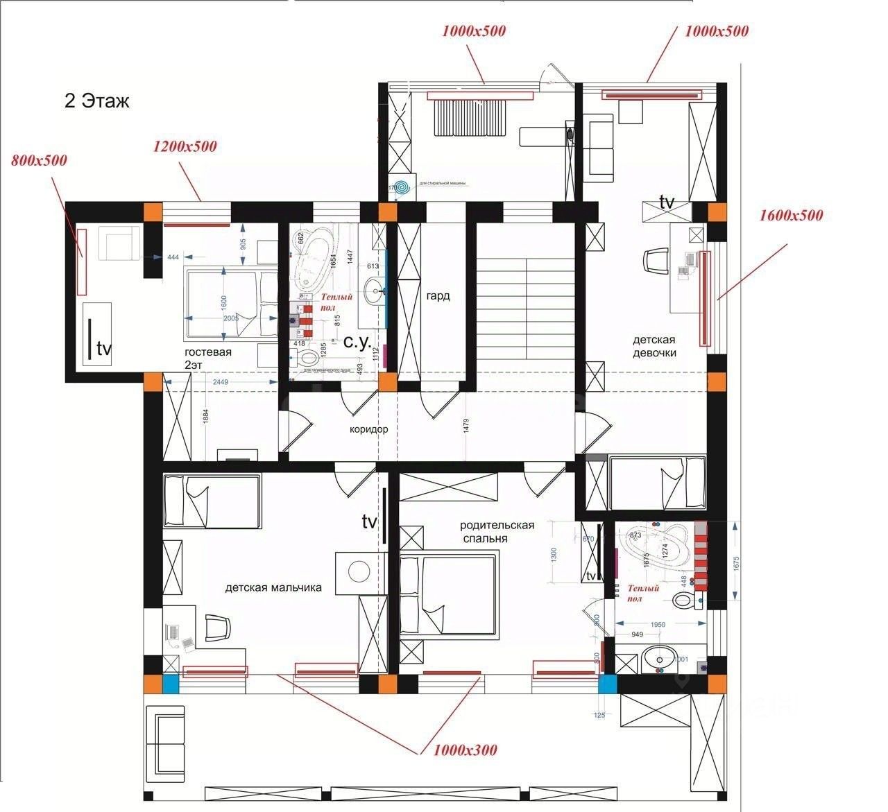 2 этаж: 4 спальни, гардеробная, два санузла, 3 крытых террасы.