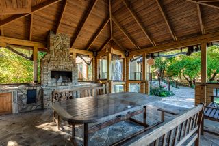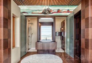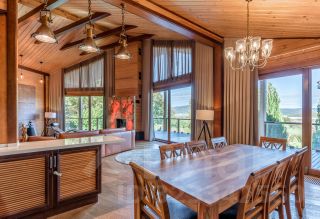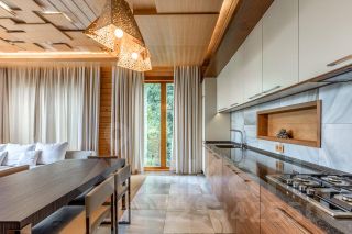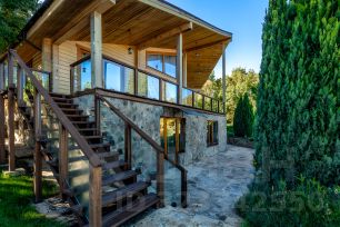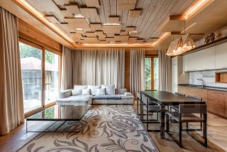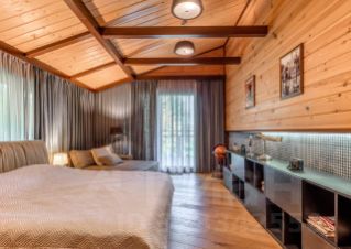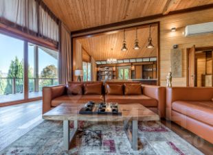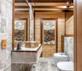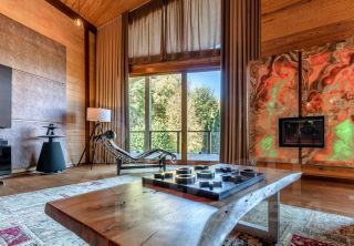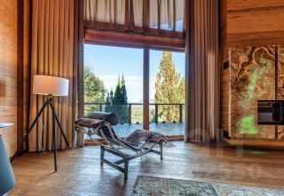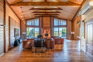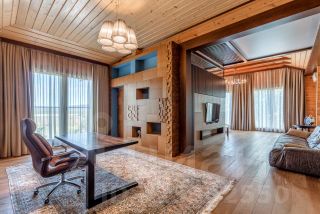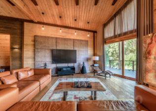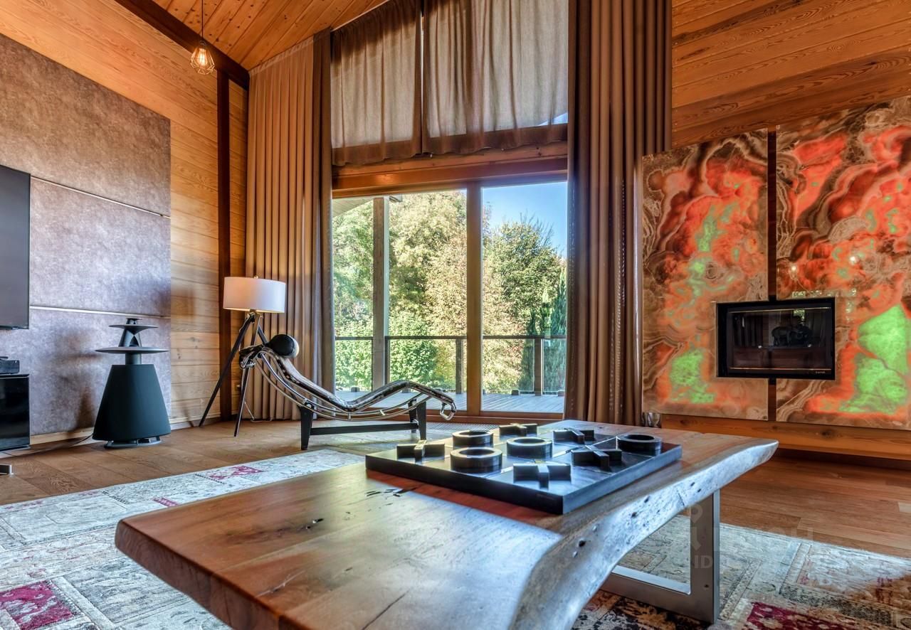 Основной дом: Аутентичное шале из натурального дерева и камня с просторной гостиной, где сердцем дома становится горящий камин с порталом из массива оникса.