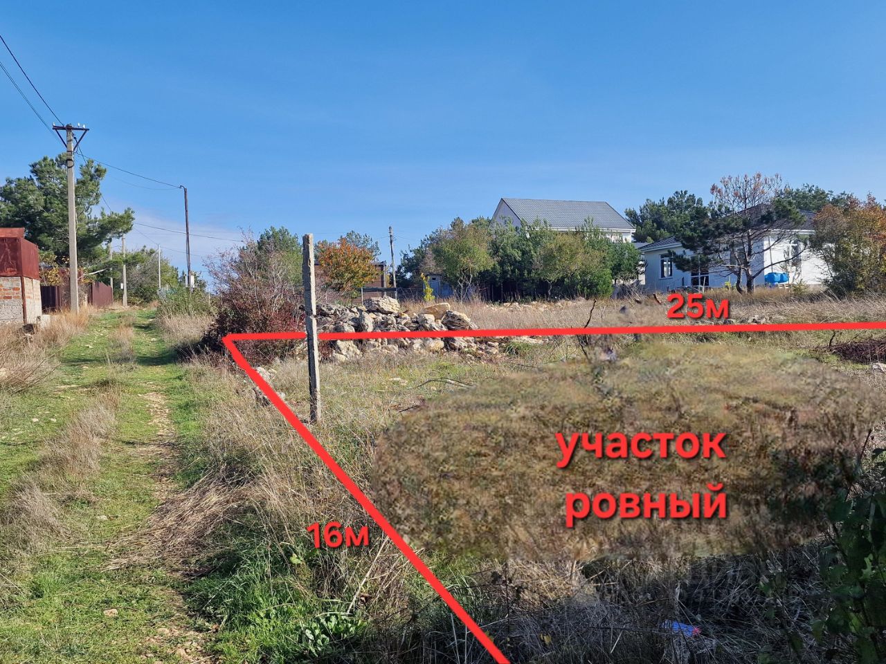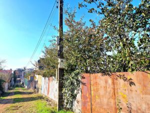 4 сотки, ровный, правильной прямоугольной формы 16х25м. Участок без строений, ям и бугров. Есть металлический туалет и растут два дерева черешни.