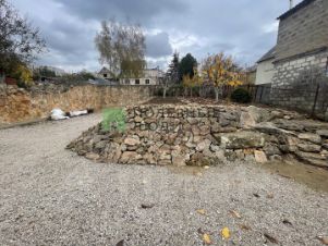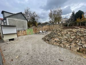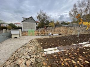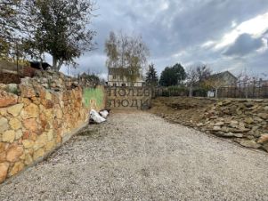 Участок с двух сторон огорожен хорошим забором из бута. По фасадной части забор из металопрофиля (на период строительства) с широкими воротами (зайдет любая техника).