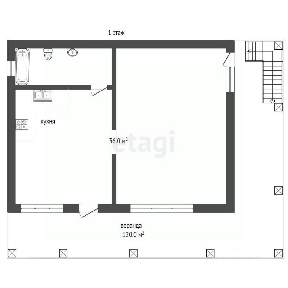 Первый этаж: большая кухня, комната и санузел.
