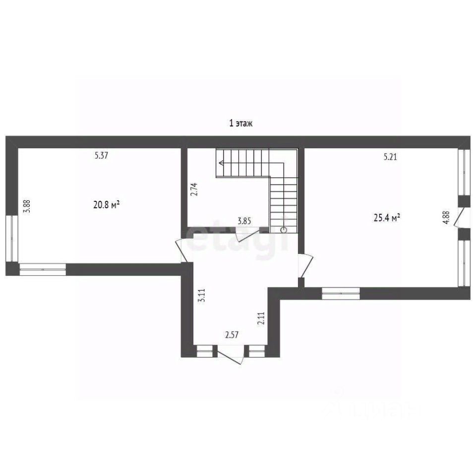 1 этаж: прихожая, спальня или кабинет 20м2, санузел, просторная кухня-гостиная 25 кв.м. с выходом в зону барбекю.