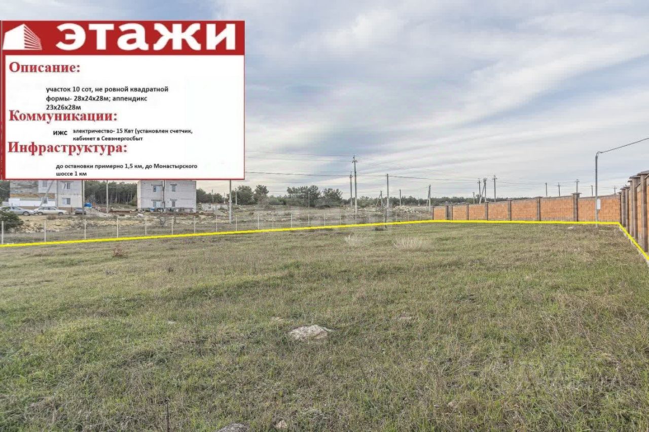 Участок ровный. Земля не обработанная. Ограждена забором. Глубина грунта 2-3 метра до скалы - на участке можно садить деревья. Есть ПОДКЛЮЧЕНИЕ электричества - 15 Квт (установлен счетчик, кабинет в Севэнергосбыт)!