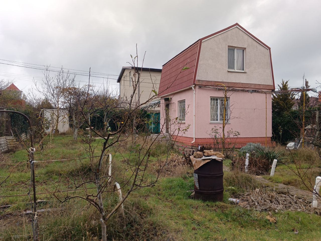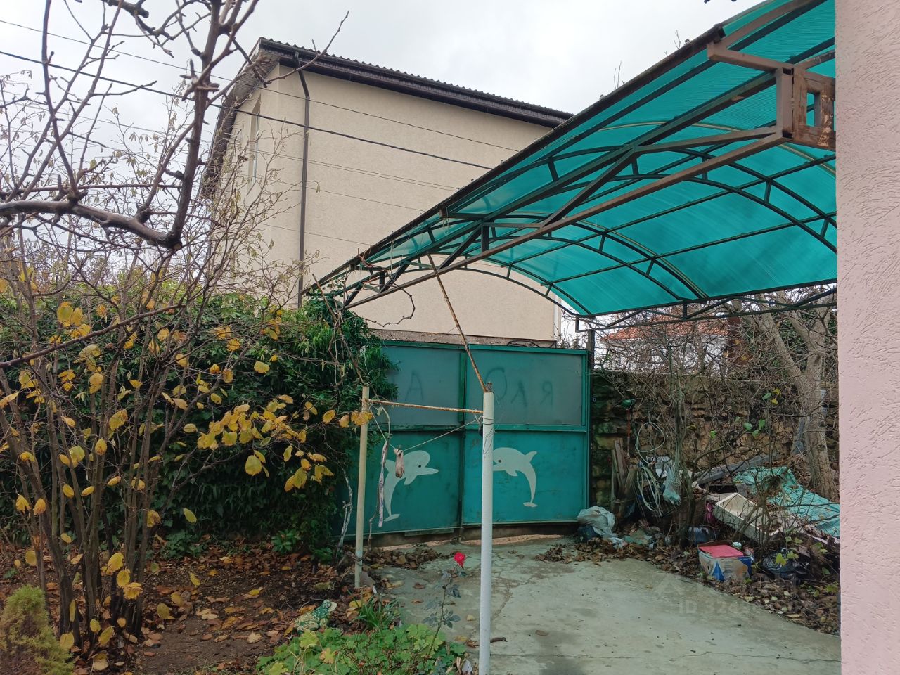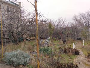 Участок огорожен забором , есть парковочное место. Растёт много плодоносящих деревьев:инжир, вишня, черешня, персик, гранат.