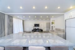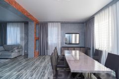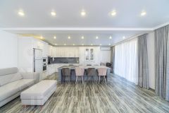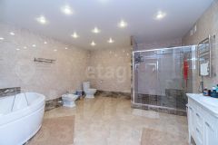 На первом этаже расположены: просторная кухня-гостинная (55 кв.м.) с премиальной мебелью сделанной заказ и отдельным выходом во двор, санузел с душевой и биде (20 кв.м.), гараж (37,5 кв.м.), прачечная и котельная, а также отдельная комната для хранения оружия. Второй этаж включает в себя прихожую, три уютные спальни, ванную комнату и светлую гостиную с выходом на застекленную террасу, откуда открывается потрясающий вид на всю долину!