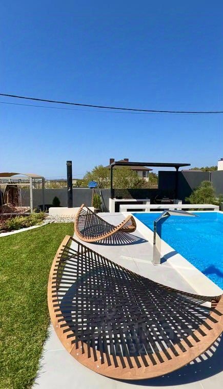 - зона барбекю: газовый гриль, дизайнерская раковина, барная стойка со стульями, летний душ с горячей/холодной водой, бунгало.