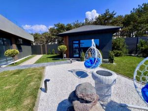 - зеленый газон с автополивом, газонокосилка, дизайнерский фонтан из натуральных камней, качели для релакса.