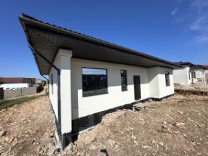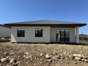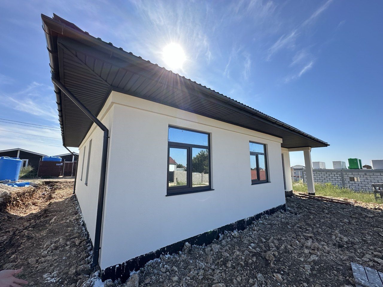 Конструктив: Ленточный фундамент, стены из газоблока (300 мм), перегородки (200/100 мм), крыша — металлочерепица, фасад отделан камешковой штукатуркой.
