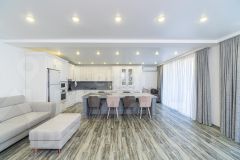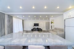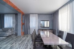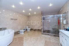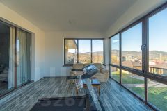На первом этаже расположены: просторная кухня-гостинная (55 кв.м.) с премиальной мебелью сделанной заказ и отдельным выходом во двор, санузел с душевой и биде (20 кв.м.), гараж (37,5 кв.м.), прачечная и котельная, а также отдельная комната для хранения оружия. Второй этаж включает в себя прихожую, три уютные спальни, ванную комнату и светлую гостиную с выходом на застекленную террасу, откуда открывается потрясающий вид на всю долину!