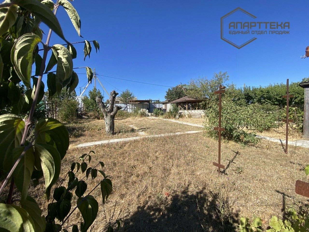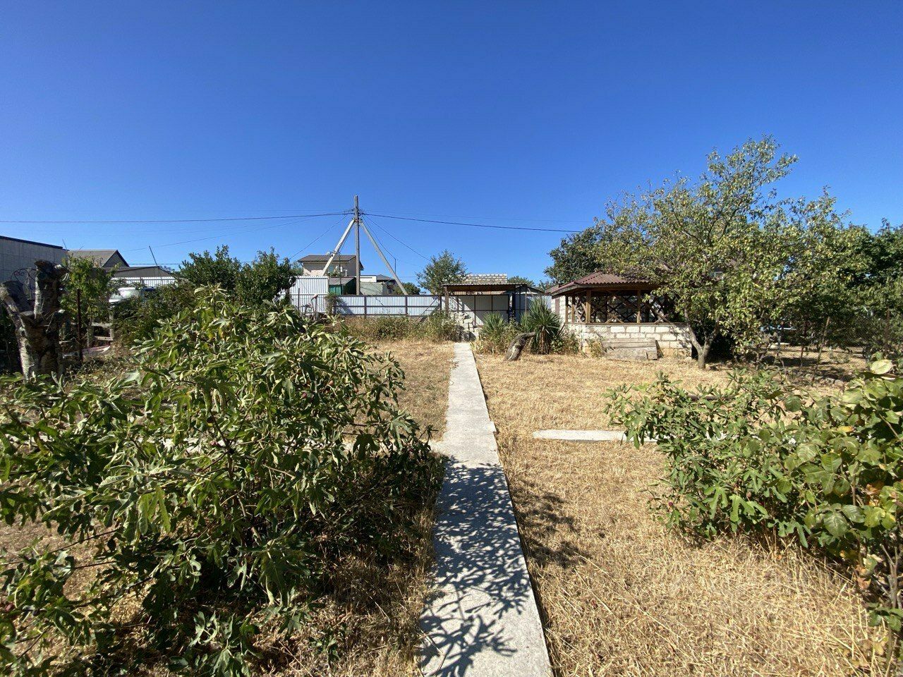 Участок прямоугольный, по фасаду- 17 метров, огорожен забором из профнастила, установлены откатные ворота, калитка, длина 23 метра. На участке сооружен навес для парковки автомобиля, небольшой незарегистрированный домик, которому найдётся достойное применение в хозяйстве (обустройство бани или дополнительного технического помещения для будущего дома и т.д) В тени фруктовых деревьев расположилась уютная беседка. На территории есть бетонное сооружение для обустройства септика.