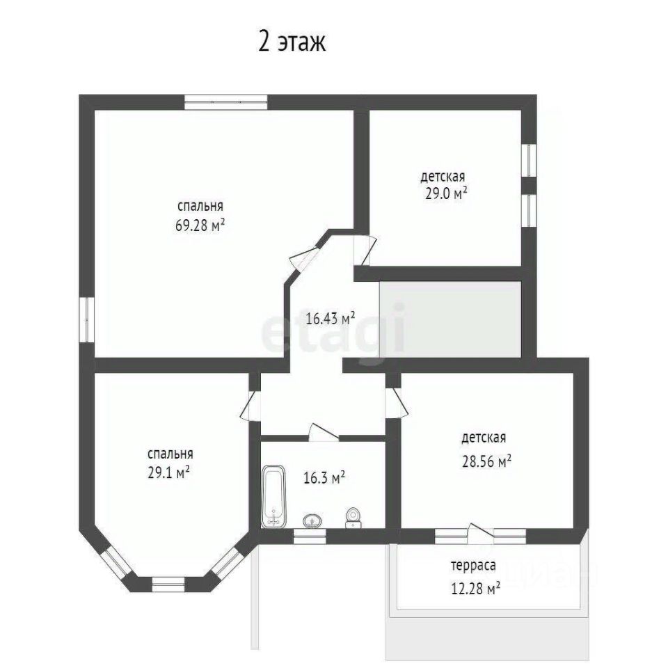 - На 2м этаже: четыре изолированных комнаты: 45,74м2, 26,28м2, 25,2м2, 23,76м2, санузел 13м2 и большой балкон 36,8м2.
