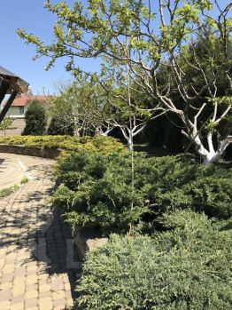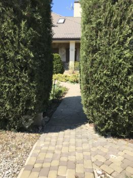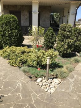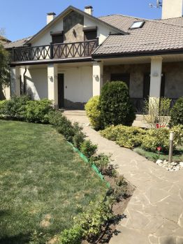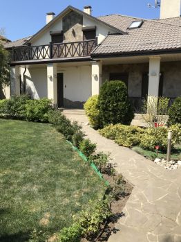 Участок и прилегающая к дому территория полностью озеленена (над проектом озеленения территории работали ландшафтные дизайнеры), установлена система автоматического полива. На участке расположена крытая парковка, зона барбекю с мебелью из дуба в китайском стиле, беседка