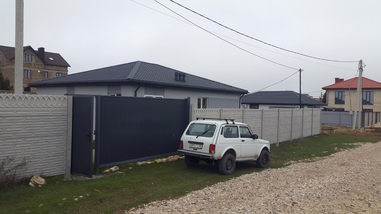 Участок ограждён бетонным забором. Ворота и калитка из металлопрофиля.
