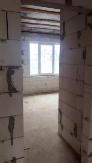 Фундамент - монолитная плита. Материал стен - газобетон. Стены снаружи утеплены пенопластом и оштукатурены. Оконные и входные дверные проёмы - металлопластиковые. Чердачные перекрытия - деревянные лаги. Крыша - металлочерепица. Состояние внутренней отделки - "без отделки" после строителей.