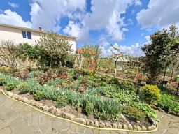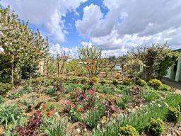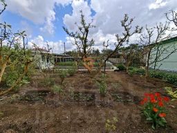 Участок благоустроен, произрастает плодоносящий сад, а также разбито множество клумб и грядок.