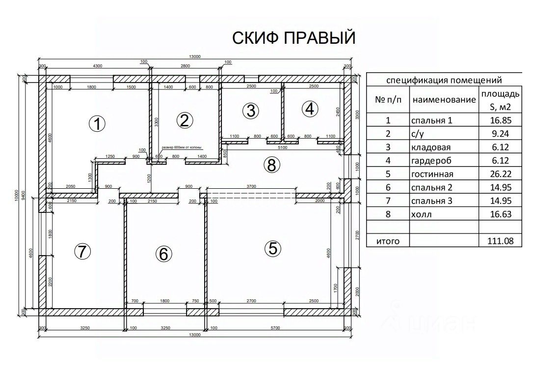 Общая площадь: 130 м² (внутренняя отапливаемая — 111,08 м²).