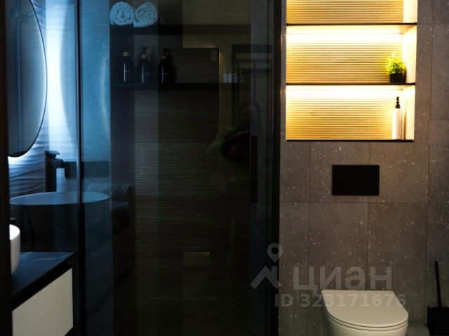 - В ванной комнате душ, стиральная машинка, инсталляция, подвесная раковина с тумбой, зеркало, электрический полотенцесушитель, средства гигиены, капсулы для стирки;