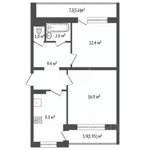 включает в себя прихожую, кухню-гостиную, две спальные комнаты, санузел с душевой.